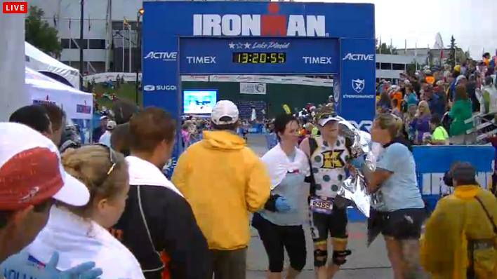 In the end my final time was 13:12:58. Somehow, I had even gone faster than all of my teammates. They all had faster bike splits than me. But my strong swim and even stronger run made my finishing time just slightly faster than them. I never thought that would happen. Here is a shot Bryan captured on his computer while watching from Richmond. Thanks Bryan. This is right after I crossed the finish and the "catchers" were escorting me away from the finish line. Ironman has so many great volunteers. They walked me over to the guy who would remove my chip. He looked me in the eye and said, "Don't move" and then took my chip off. I imagine some delirious finishers might accidentally kick the guy in the face so I think he was being extra careful.